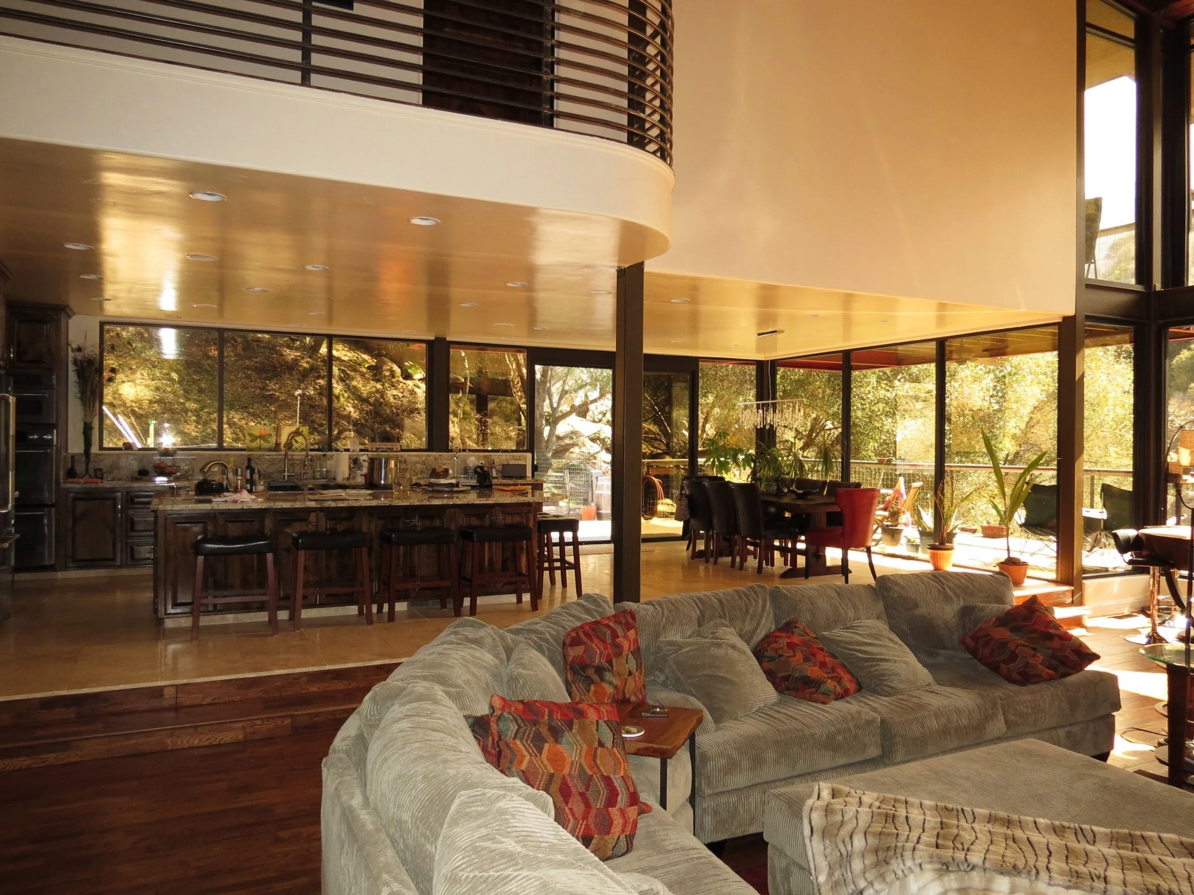 The interior stair was designed as a single-run stair, parallel to the existing Family Room and acting as a divider between it and the covered deck. It is surrounded by a glazed cube on two sides that visually connects to the deck beyond and the pool deck below. All openings on the south facade (facing the pool) were replaced with multi-panel floor-to-ceiling french doors to allow an abundance of natural light, and maximize connectivity to the exterior. The existing attic space above the Kitchen was converted to a high-vaulted ceiling, and the covered deck roof was replaced with a reverse-pitch open-beam ceiling that sloped upwards towards the sunlight streaming in from the south. Above the deck roof, additional transom windows were added to introduce more light into the interior Dining and Kitchen. New Ipe decks were built adjacent to the Blue Room and Master Bedroom, and a widened, more elegant stair connected the Ipe decks to the existing pool below.